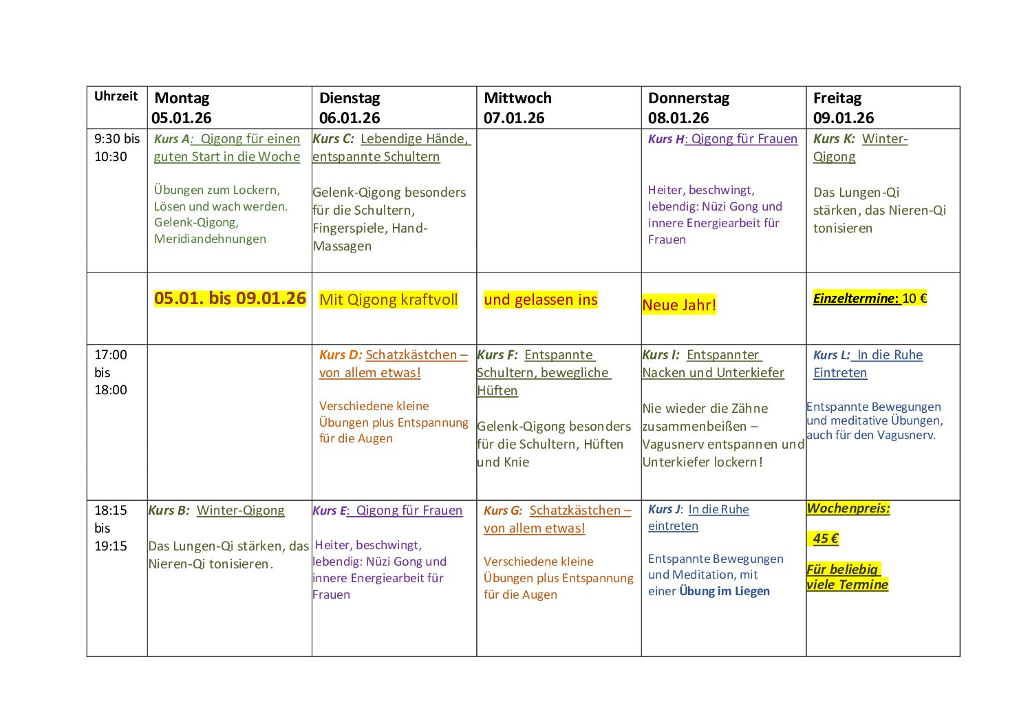 Der Kurs eignet sich zum Kennenlernen von Qigong genauso wie zum Genießen von Langsamkeit, sanften Bewegungen und Meditationen in Ruhe und Gelassenheit!